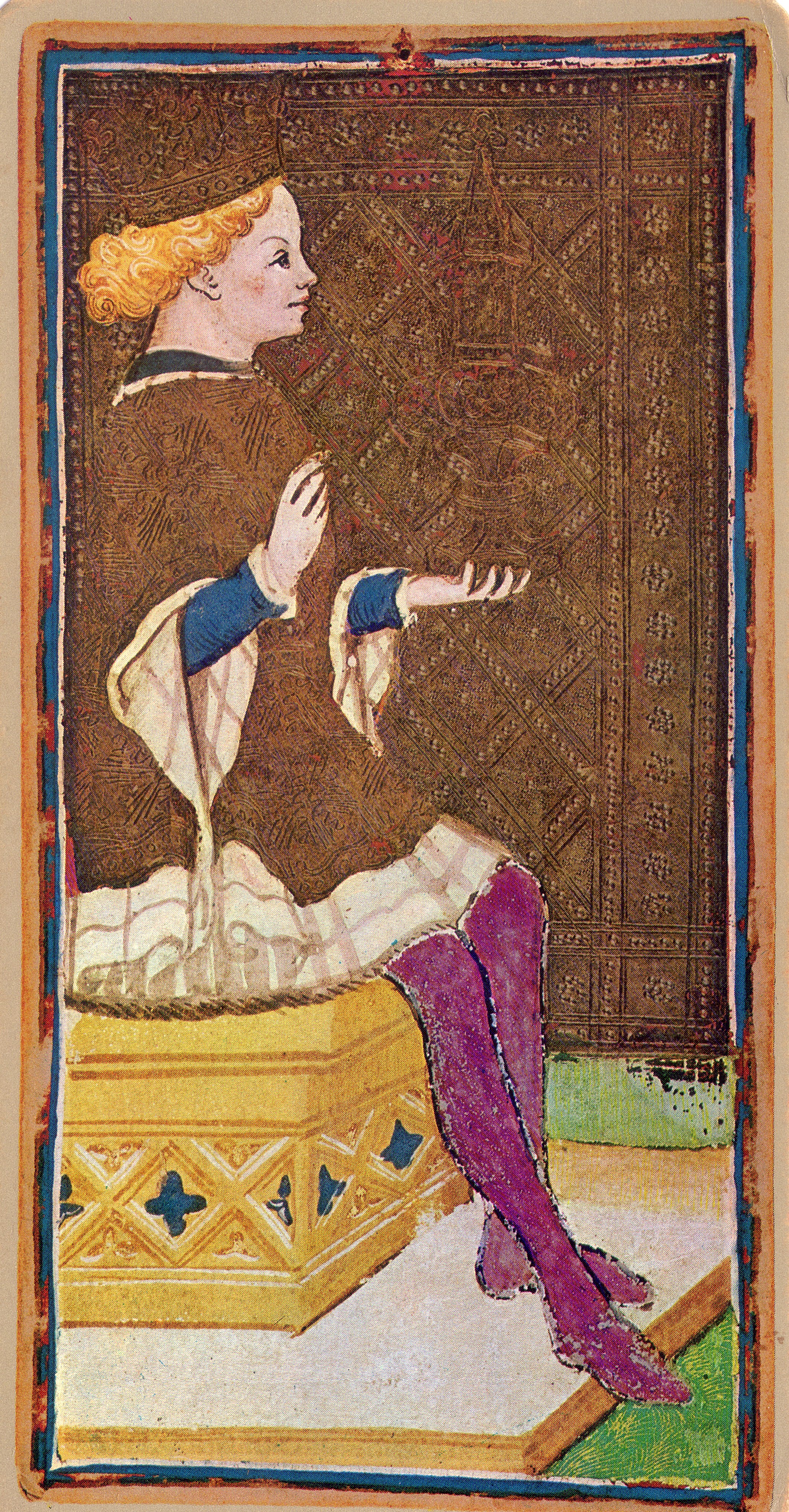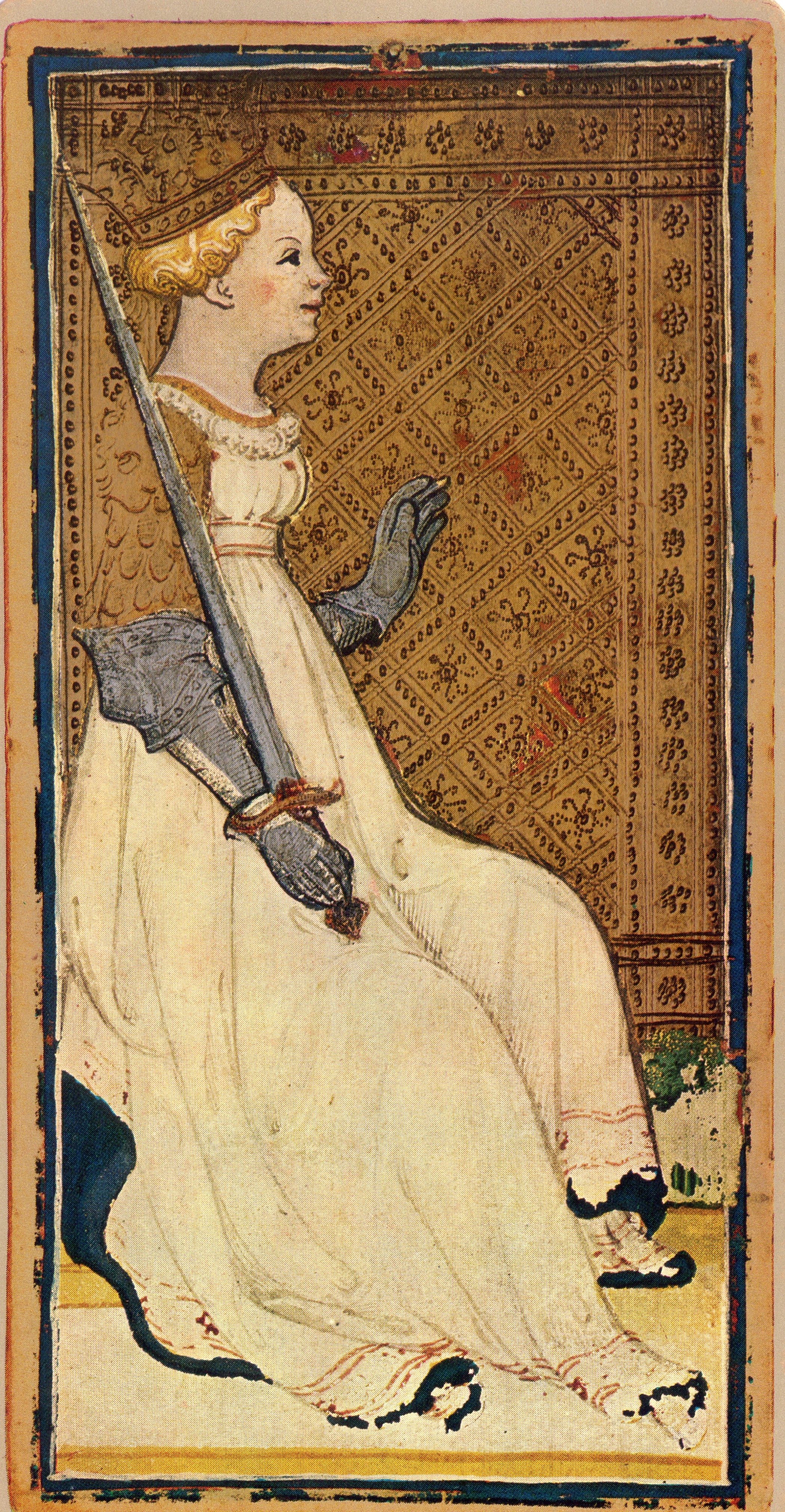 Dans l’entrelacs des branches, un petit oiseau chante comme en une volière ouverte sur l’amour. La légende est dorée de ses espoirs bleutés dans le soleil immense. Le ciel est déployé et la Dame d’épée tend une main clémente au gentil Chevalier que porte la vaillance. Les manteaux sont ourlés d’or et brodés d’écus sur fond de vert et bleu
